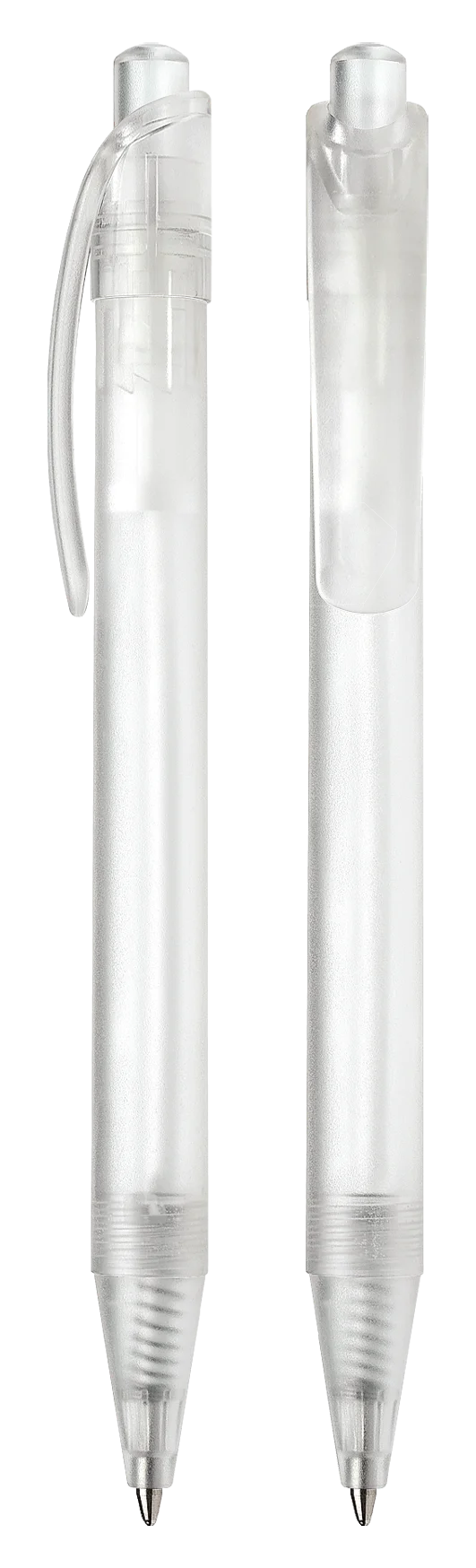 Druckkugelschreiber aus transparentem oder opakem Kunststoff.