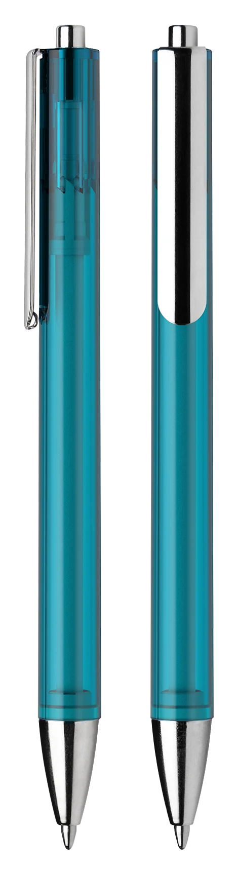 Druckkugelschreiber aus transparentem oder opakem Kunststoff.