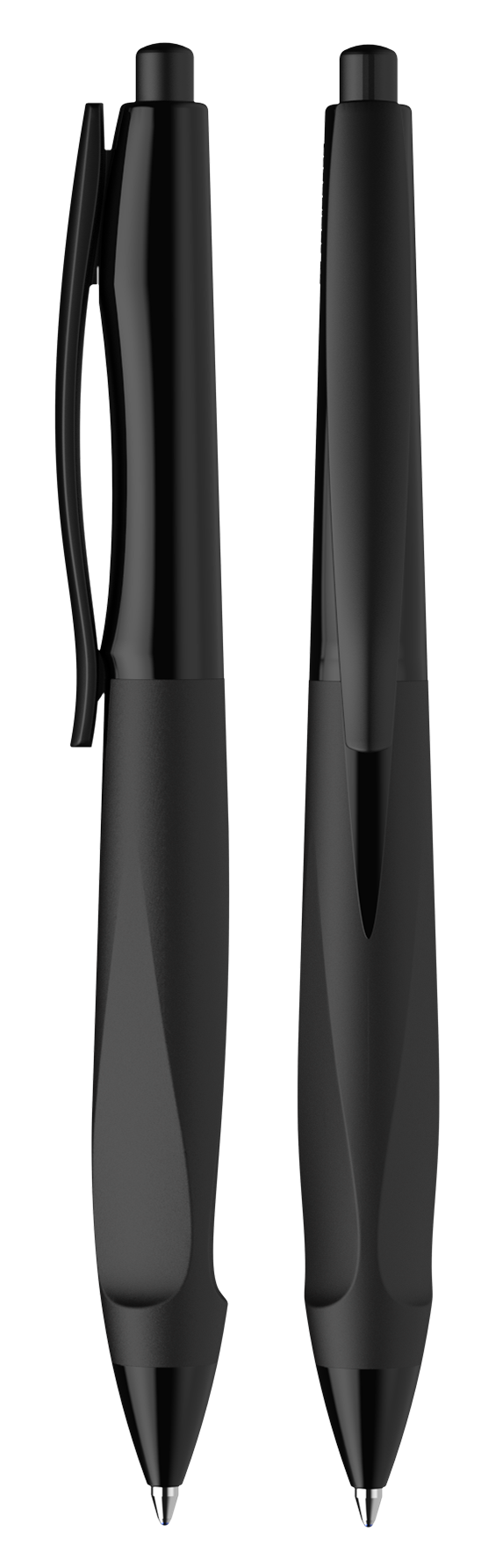 Druckkugelschreiber aus transparentem oder opakem Kunststoff mit glänzender Oberfläche.