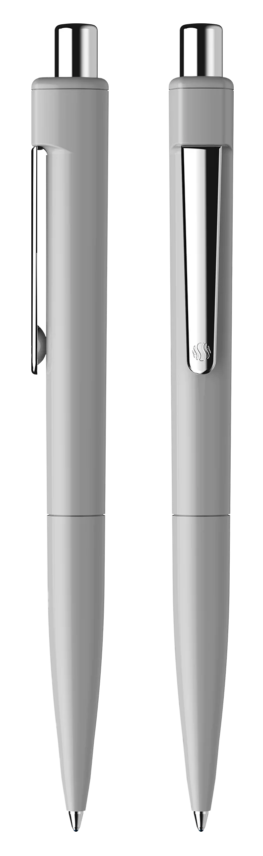 Klassischer Druckkugelschreiber aus opakem Kunststoff.