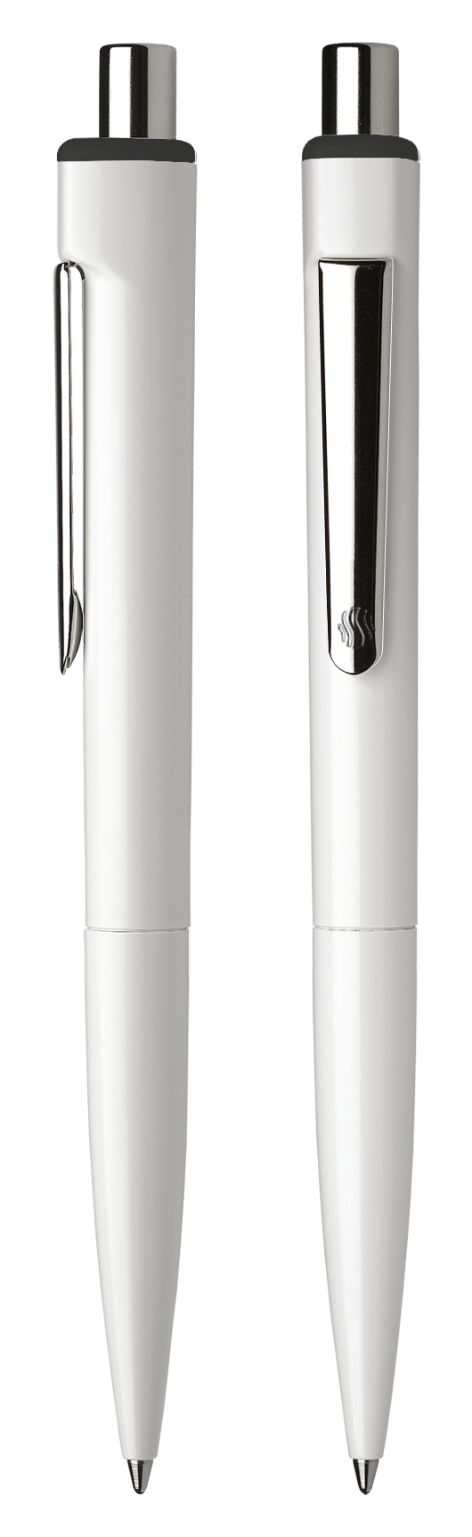 Klassischer Druckkugelschreiber aus opakem Kunststoff.