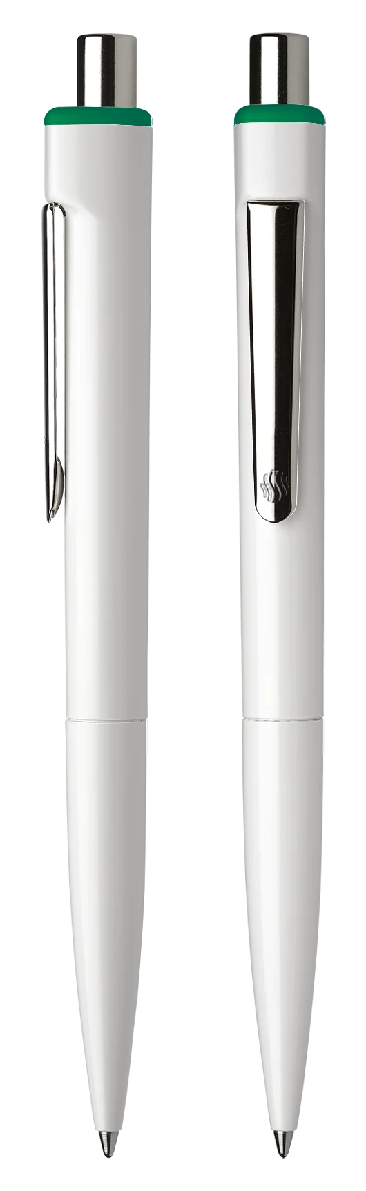 Klassischer Druckkugelschreiber aus opakem Kunststoff.