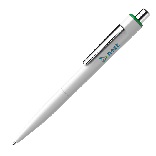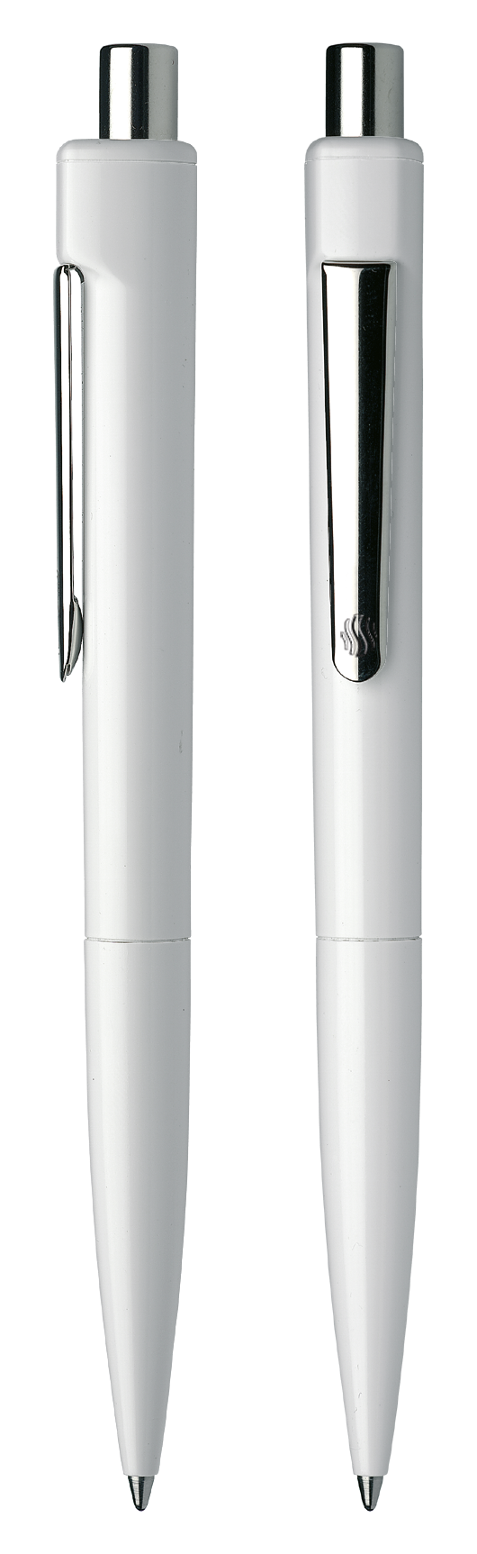 Klassischer Druckkugelschreiber aus opakem Kunststoff.