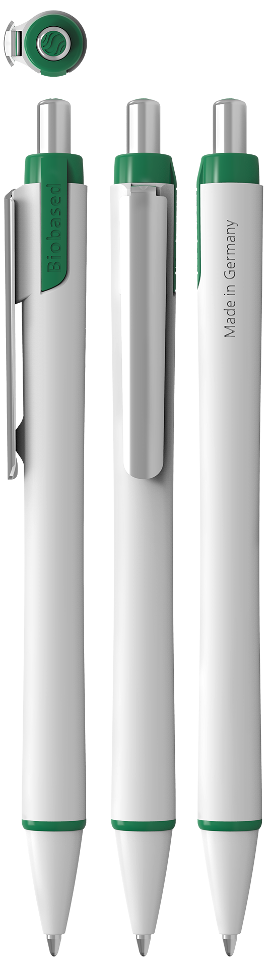 Druckkugelschreiber mit weißem Gehäuse aus 70 % biobasiertem Kunststoff. Die Viscoglide®-Technologie sorgt für außergewöhnlich weiches und gleitendes Schreiben.