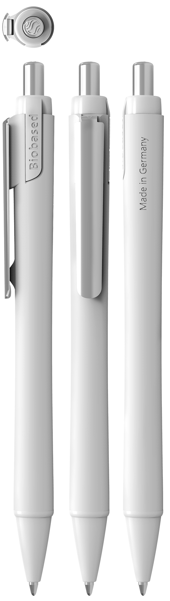 Druckkugelschreiber mit weißem Gehäuse aus 70 % biobasiertem Kunststoff. Die Viscoglide®-Technologie sorgt für außergewöhnlich weiches und gleitendes Schreiben.