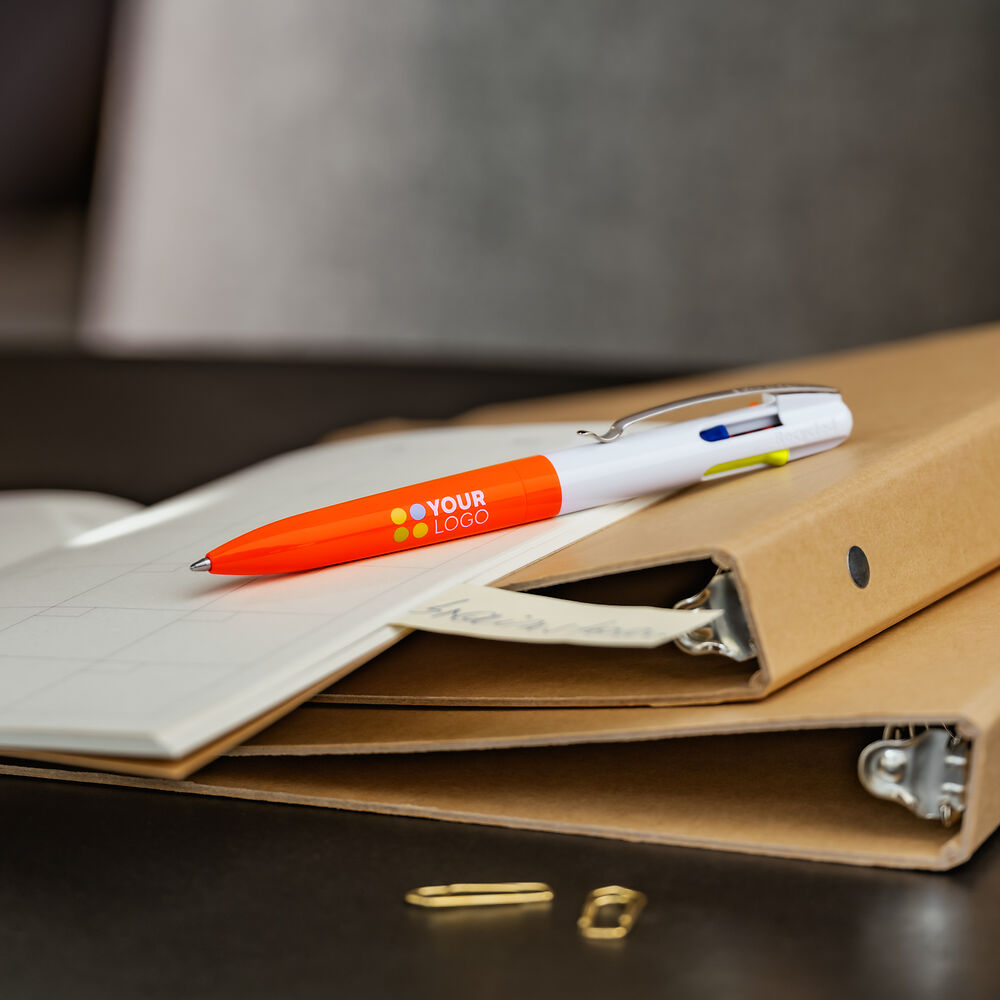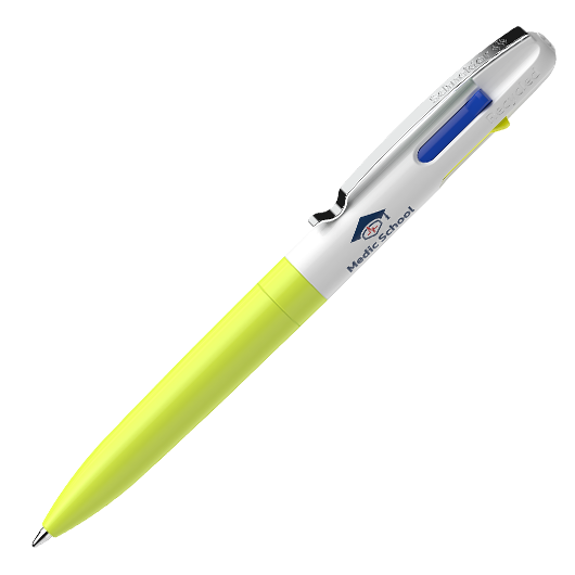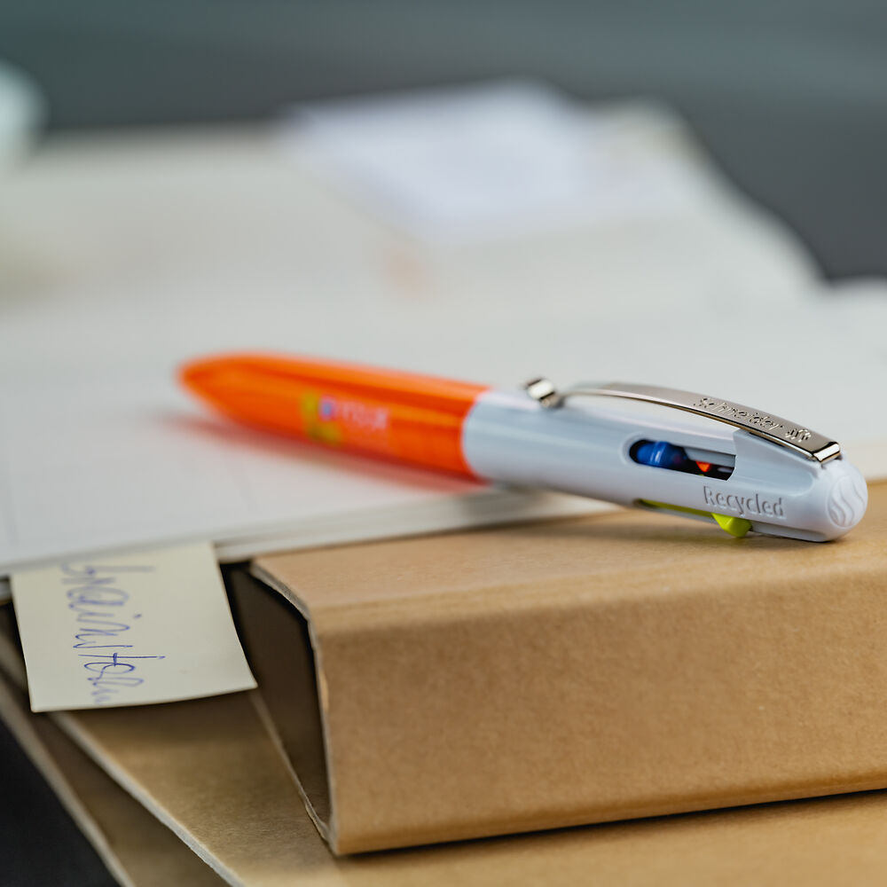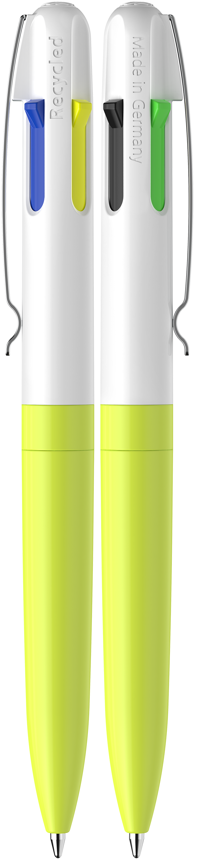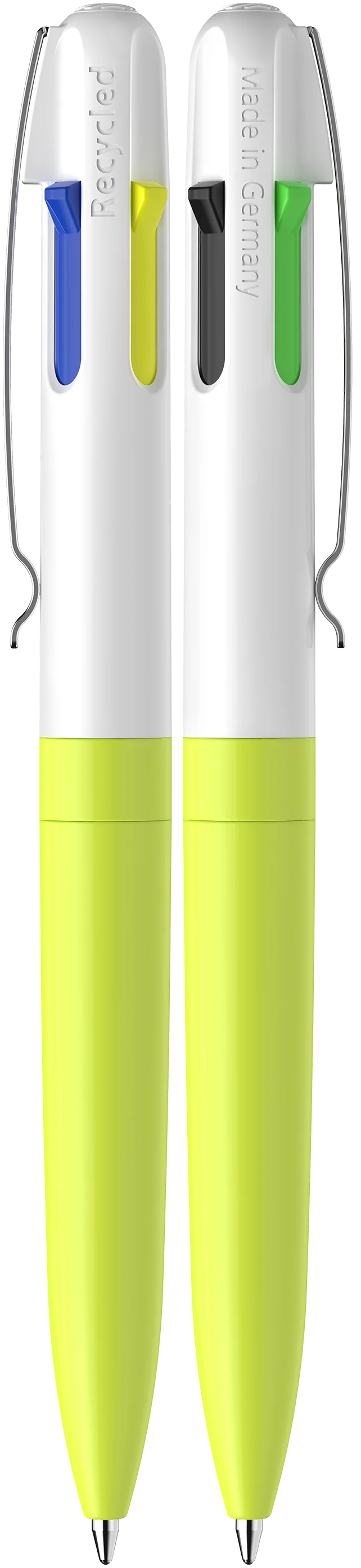 Vierfarb-Kugelschreiber in Neon-Edition mit einem Gehäuse aus 92% recyceltem Kunststoff. Erhältlich in vier knalligen Gehäusefarben mit unterschiedlichen Schreibfarben.