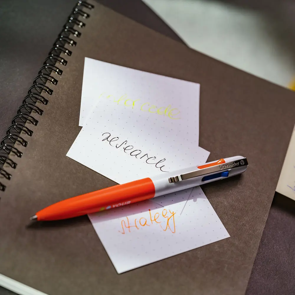 Mit schwarzer und blauer Schreibfarbe für alltägliche Notizen und einem leuchtenden Gelb als Highlightfarbe zum Hervorheben von wichtigen Informationen. Die vierte Schreibfarbe variiert je nach Farbe des Vorderteils des Kugelschreibers und setzt auffällige Akzente (pink, hellgrün oder orange). Schneller und komfortabler Farbwechsel durch farbige Schieber. Mit Viscoglide®-Technologie für außergewöhnlich weiches und gleitendes Schreiben. Strichstärke Medium (M).