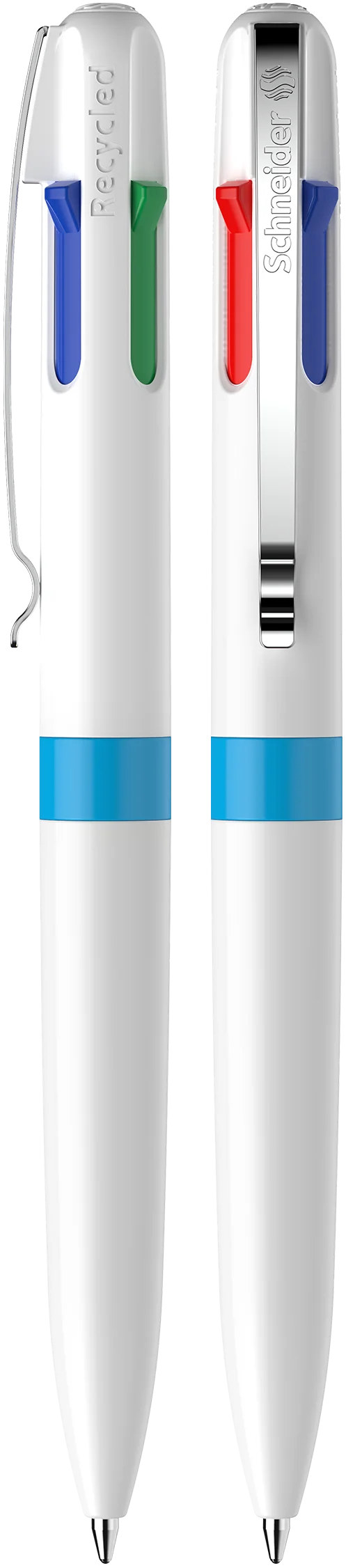 Vierfarb-Kugelschreiber mit den Schreibfarben schwarz, rot, blau und grün. Gehäuse aus 92 % recyceltem Kunststoff.