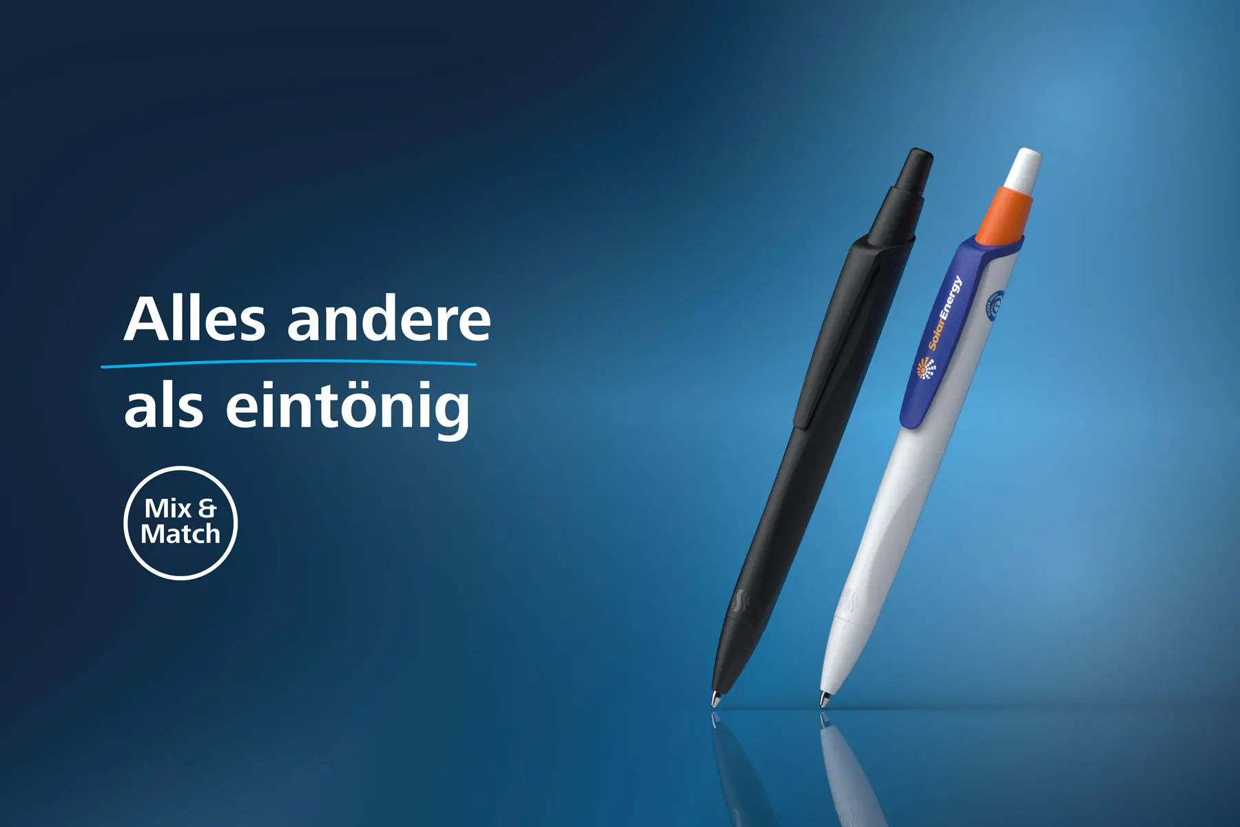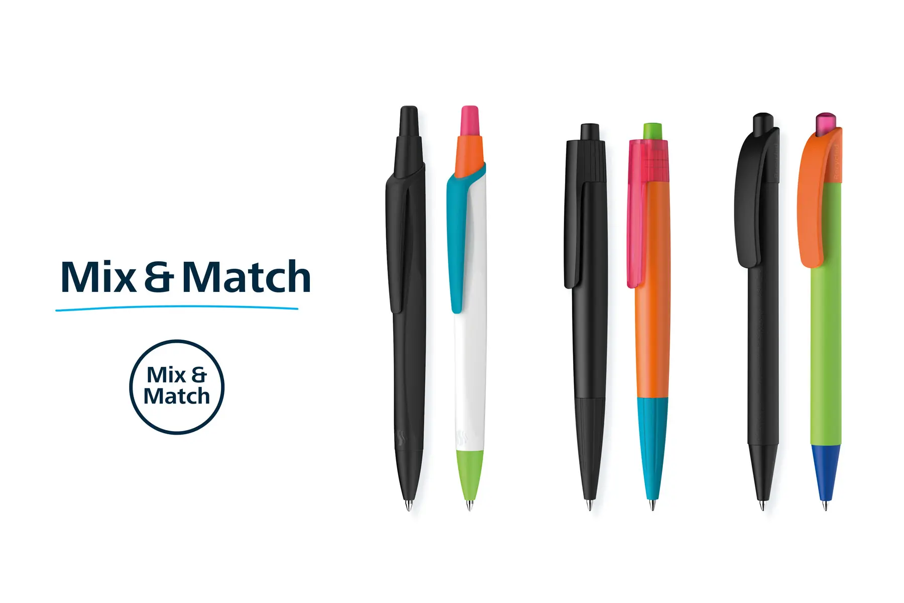Doch längst geht es bei der Wahl des richtigen Stiftes nicht mehr nur um die Schreibqualität. Die Optik spielt eine große Rolle, sei es als modisches Accessoire oder als Werbegeschenk. Genau hier setzt Mix & Match an, um den Bedürfnissen und Wünschen der Nutzer*innen gerecht zu werden. Denn mithilfe von Mix & Match können Schreibgeräte in nahezu unendlichen Farbkombinationen zusammengestellt werden. Von lebendigen Farbkontrasten bis hin zu stilsicheren monochromen Designs – der Kreativität sind keine Grenzen gesetzt.