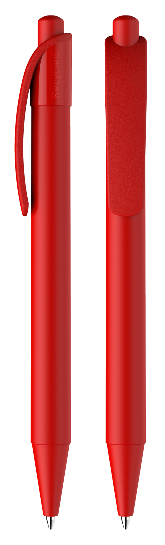 Ballpoint pen with push button made of transparent or opaque plastic. Pen body > 90 % (opaque) or 73 % (transparent) made of recycled plastic