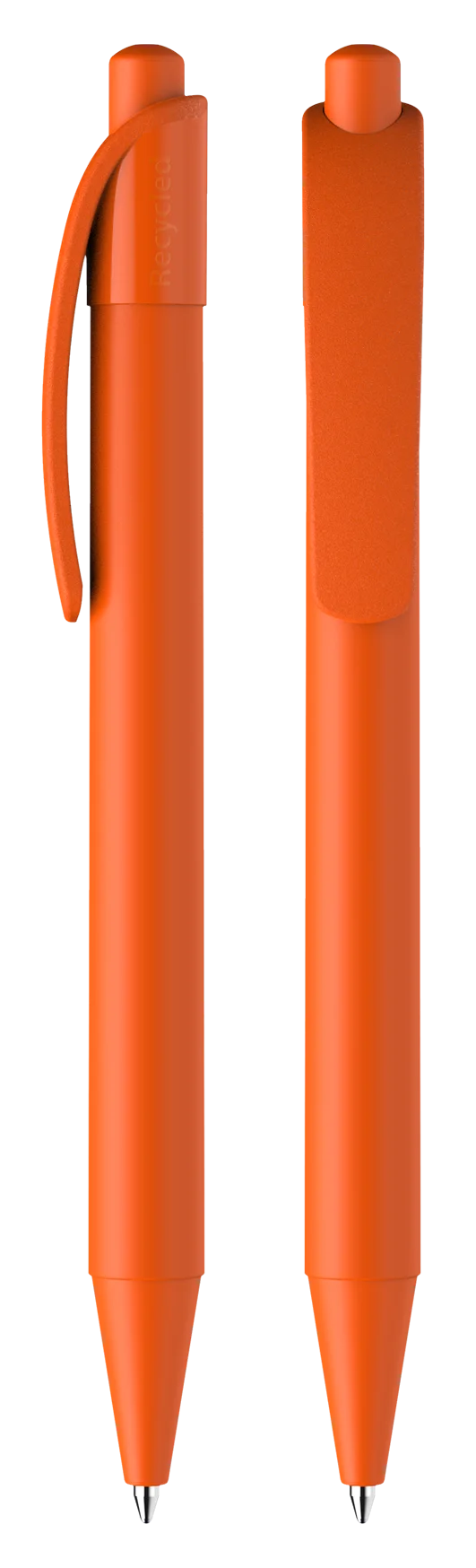 Ballpoint pen with push button made of transparent or opaque plastic. Pen body > 90 % (opaque) or 73 % (transparent) made of recycled plastic