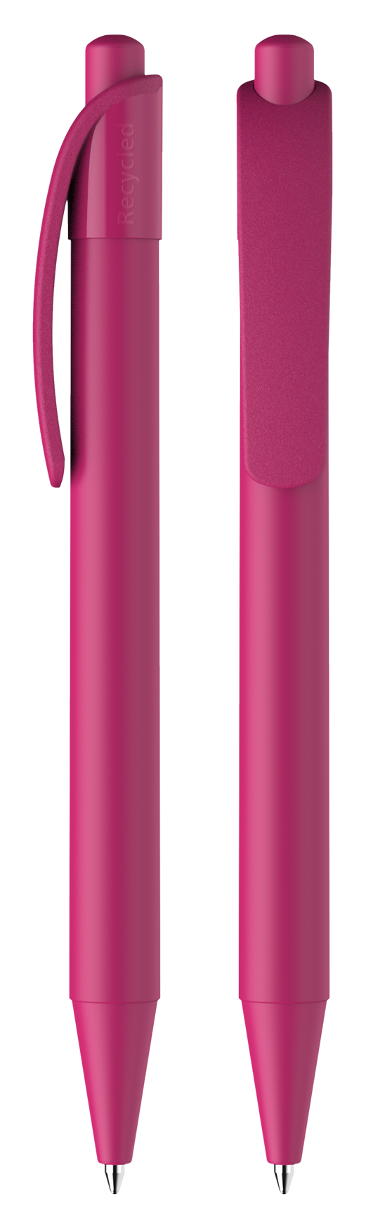 Ballpoint pen with push button made of transparent or opaque plastic. Pen body > 90 % (opaque) or 73 % (transparent) made of recycled plastic