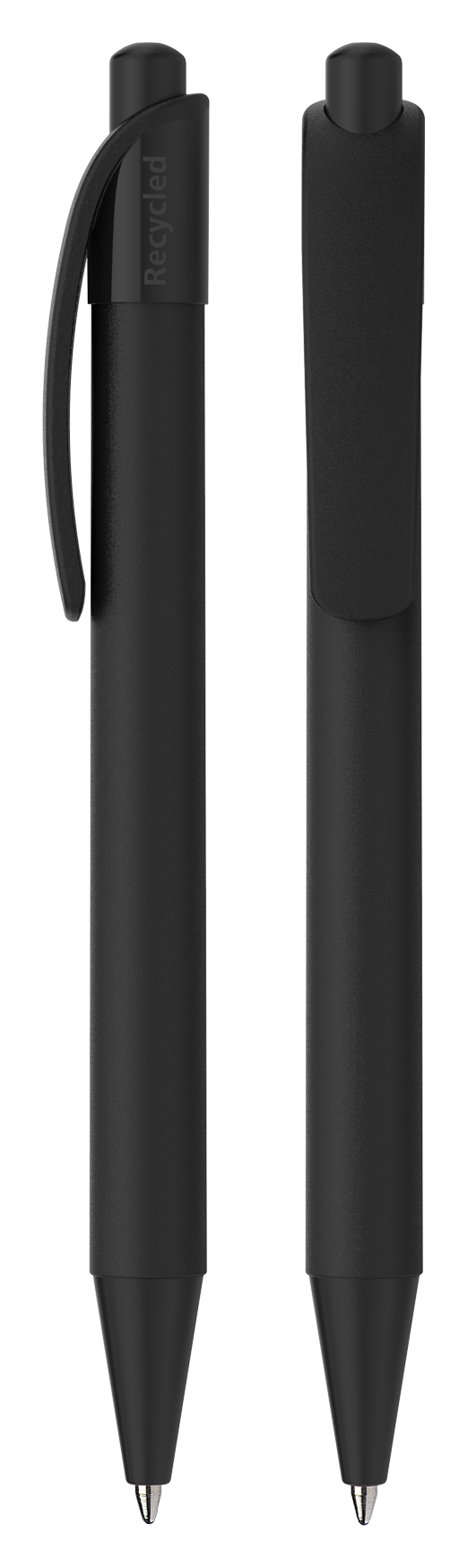 Ballpoint pen with push button made of transparent or opaque plastic. Pen body > 90 % (opaque) or 73 % (transparent) made of recycled plastic