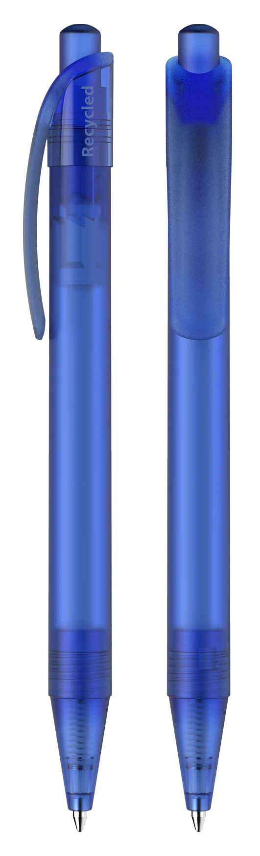 Ballpoint pen with push button made of transparent or opaque plastic. Pen body > 90 % (opaque) or 73 % (transparent) made of recycled plastic