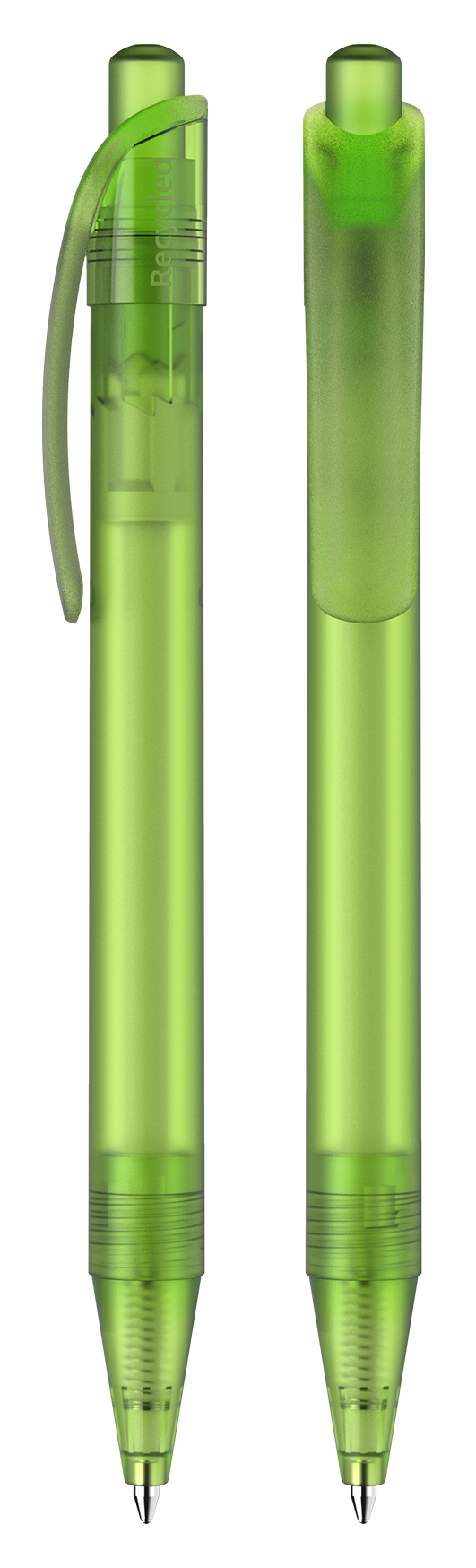 Ballpoint pen with push button made of transparent or opaque plastic. Pen body > 90 % (opaque) or 73 % (transparent) made of recycled plastic