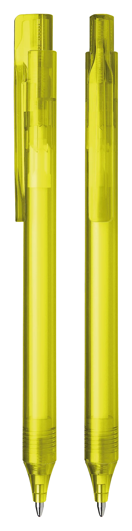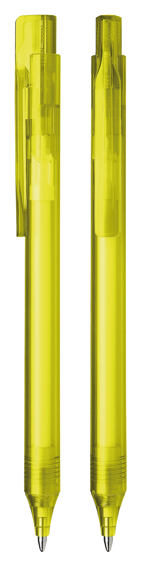 Ballpoint pen with push button made of transparent or opaque plastic.