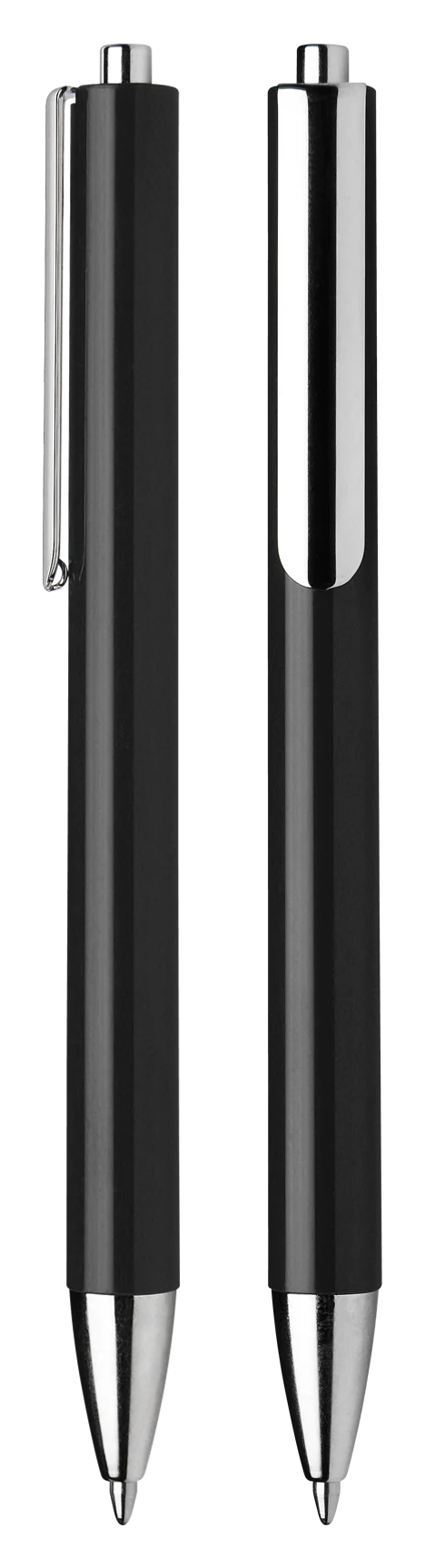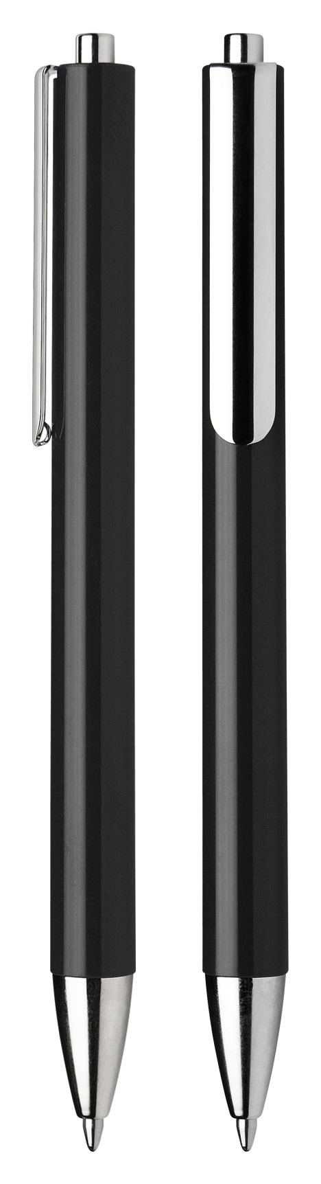 Glossy surface. Metal pen body tip, clip and push button.