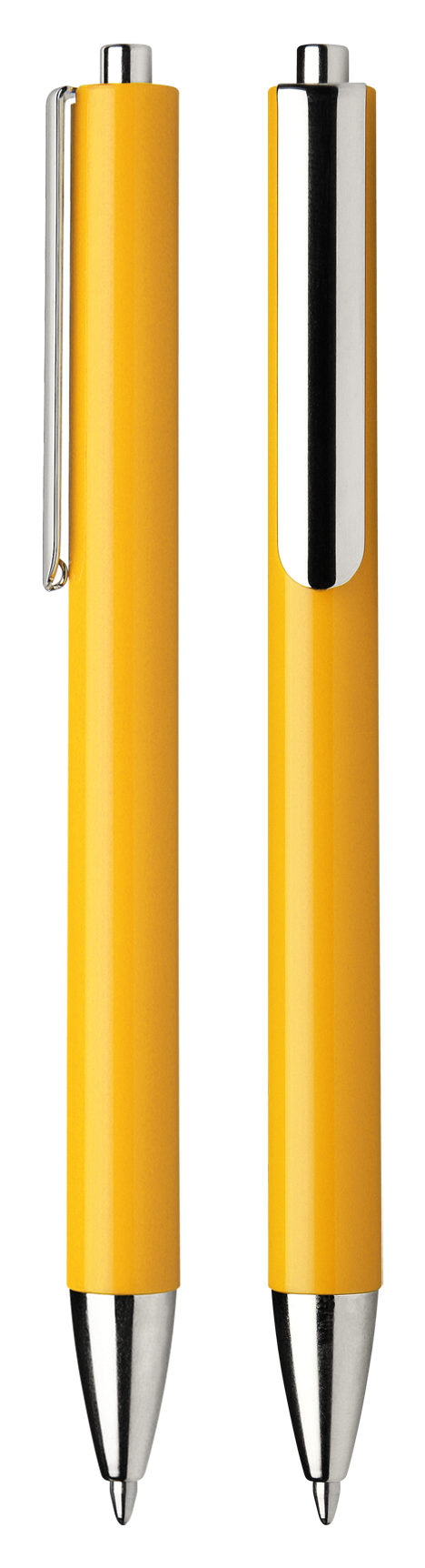 Glossy surface. Metal pen body tip, clip and push button.