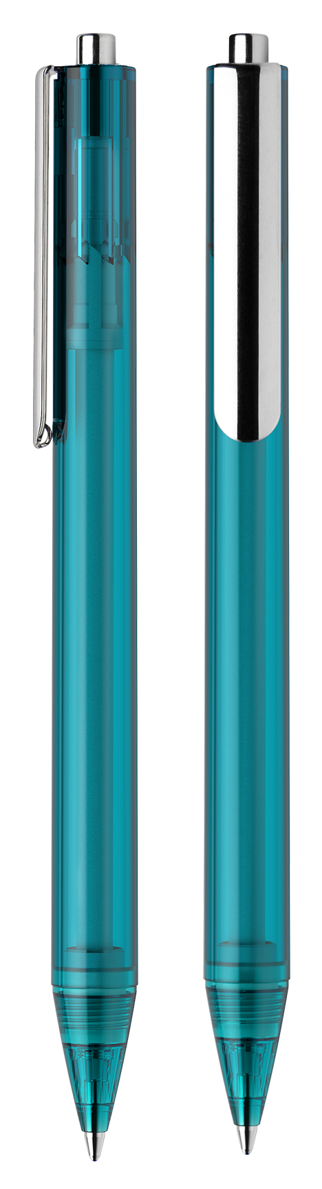 Ballpoint pen with push button made of transparent or opaque plastic.