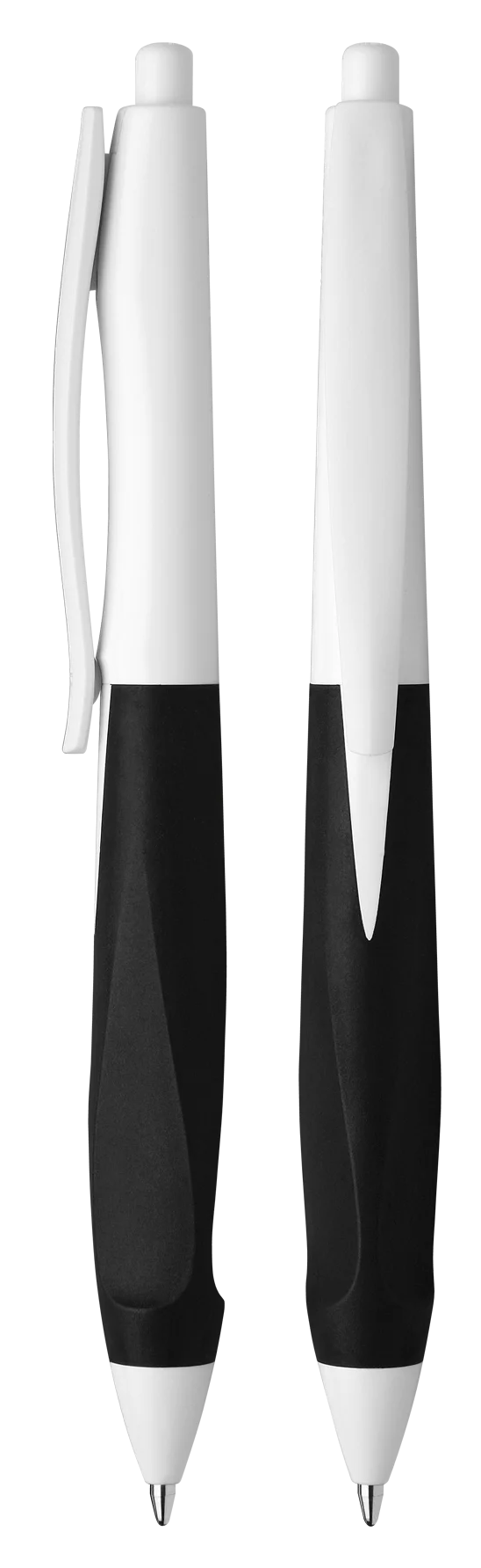 Ballpoint pen with push button made of transparent or opaque plastic with glossy surface.