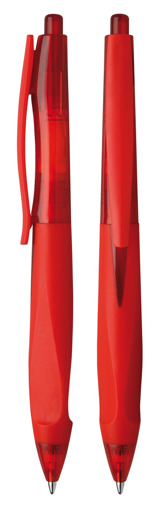 Ballpoint pen with push button made of transparent or opaque plastic with glossy surface.