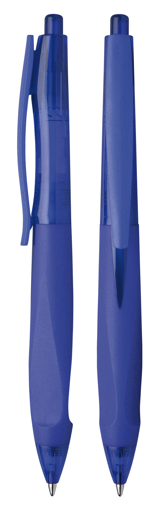 Ballpoint pen with push button made of transparent or opaque plastic with glossy surface.