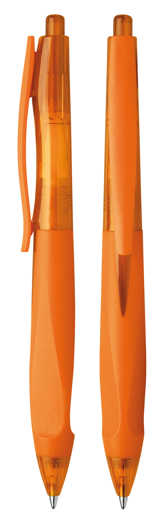 Ballpoint pen with push button made of transparent or opaque plastic with glossy surface.