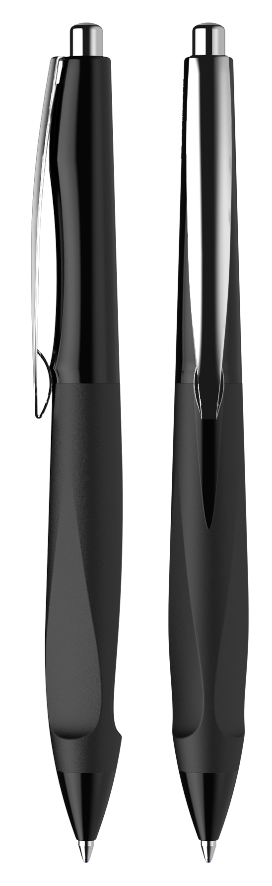 Ballpoint pen with push button made of transparent or opaque plastic with glossy surface.