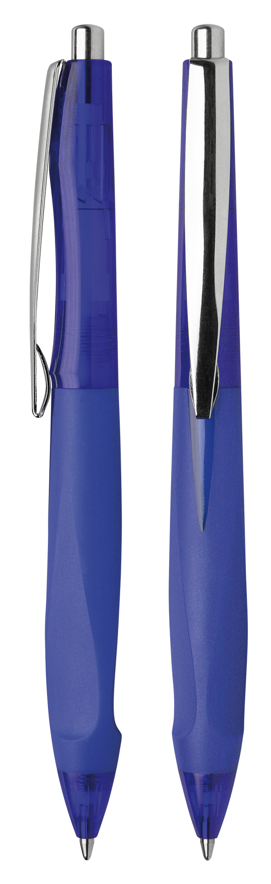 Ballpoint pen with push button made of transparent or opaque plastic with glossy surface.