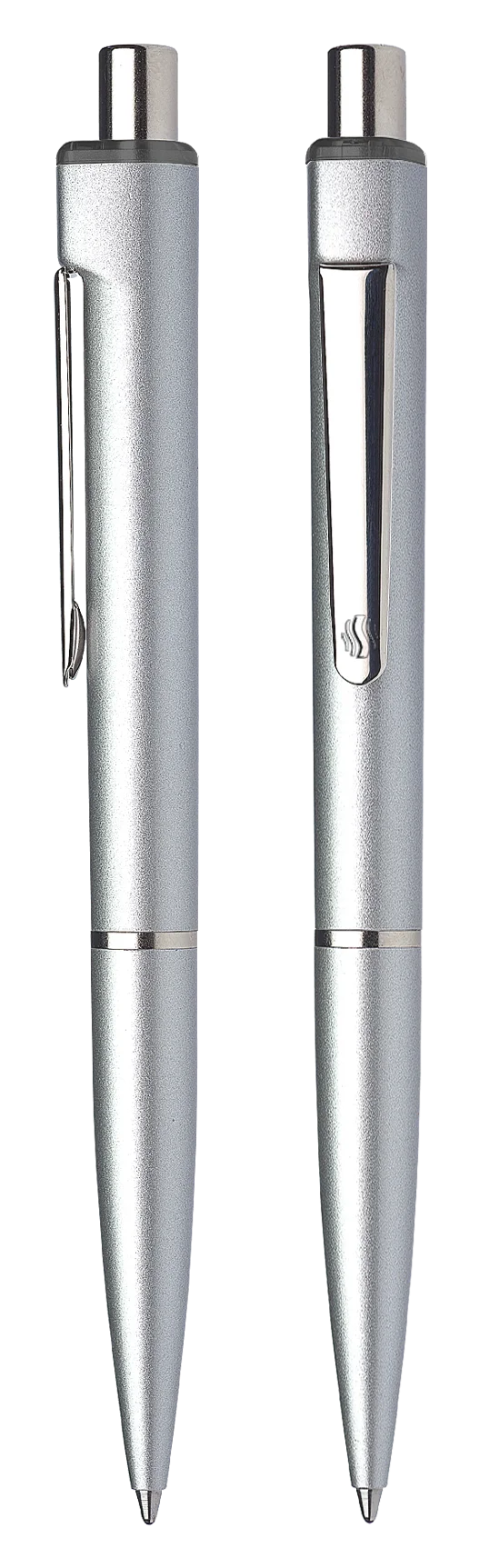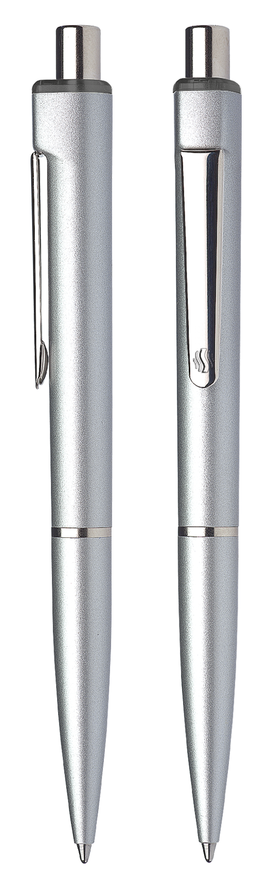 Ballpoint pens with push button made of plastic and high-quality glossy silver lacquer.