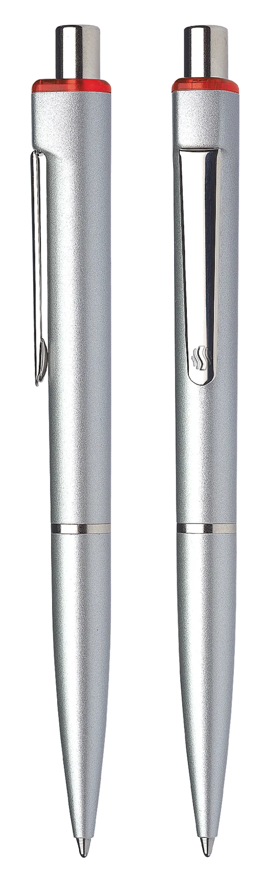 Ballpoint pens with push button made of plastic and high-quality glossy silver lacquer.