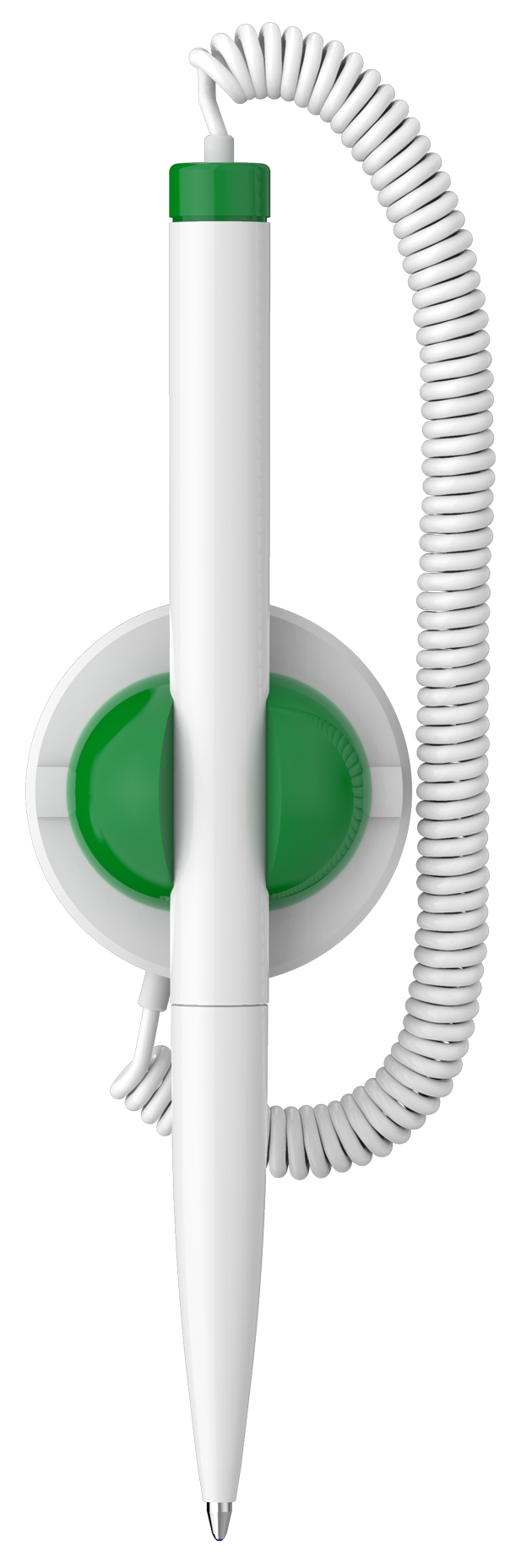 Ballpoint pen made of opaque plastic with expandable cord and pen holder to attach to a cash desk, by the telephone, in the car, etc.