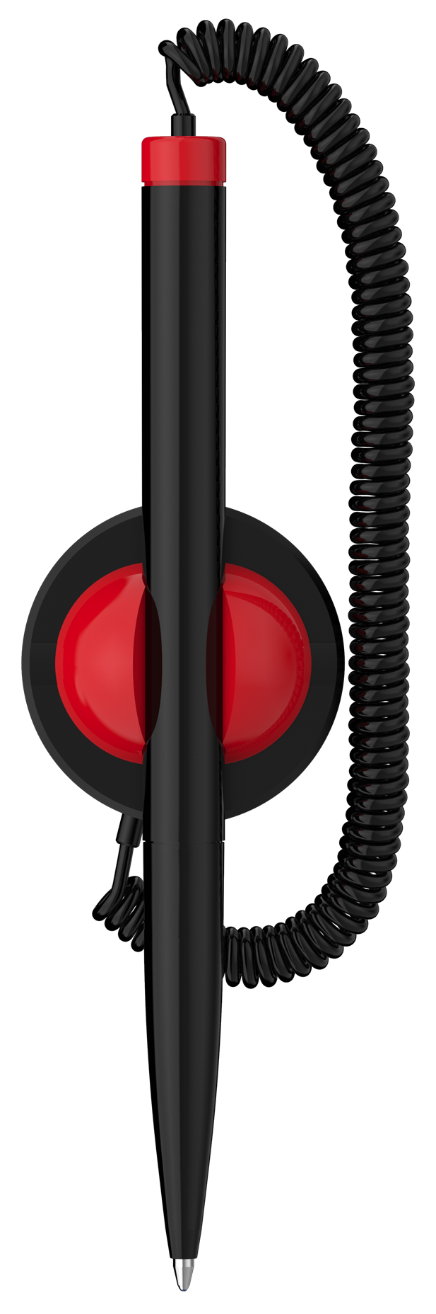 Ballpoint pen made of opaque plastic with expandable cord and pen holder to attach to a cash desk, by the telephone, in the car, etc.