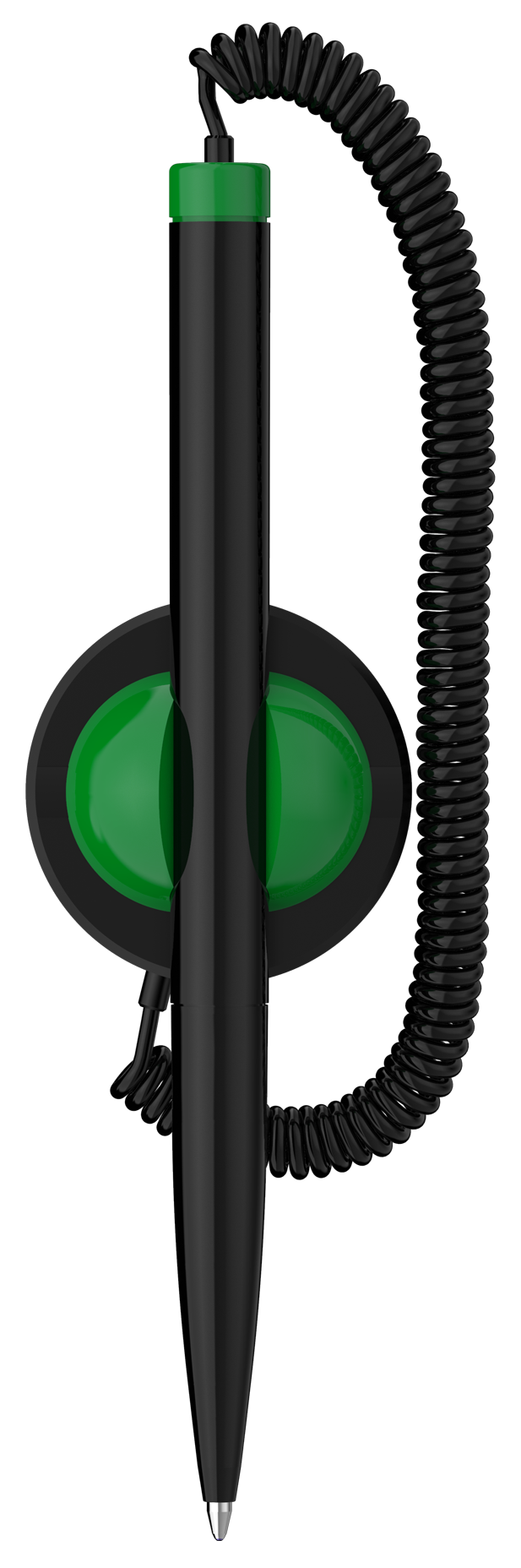Ballpoint pen made of opaque plastic with expandable cord and pen holder to attach to a cash desk, by the telephone, in the car, etc.