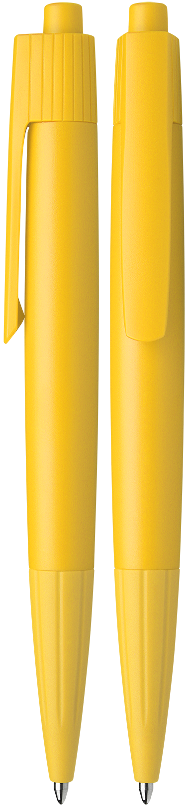 Ballpoint pen with push button made of transparent or opaque plastic in 22 fresh colours.