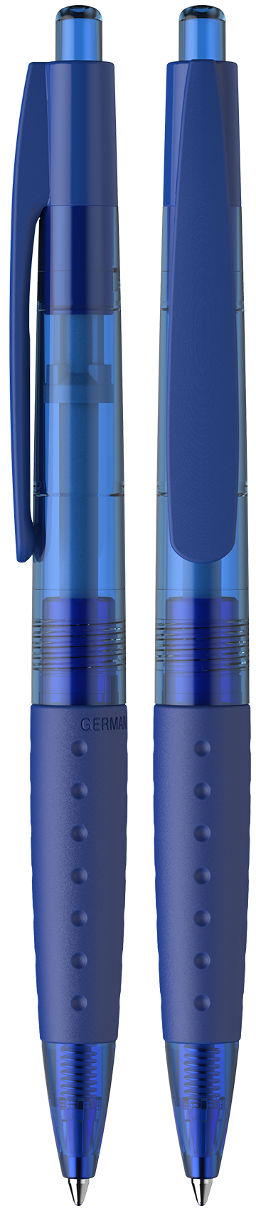 Ballpoint pen with push button made of transparent, opaque or metallic plastic.