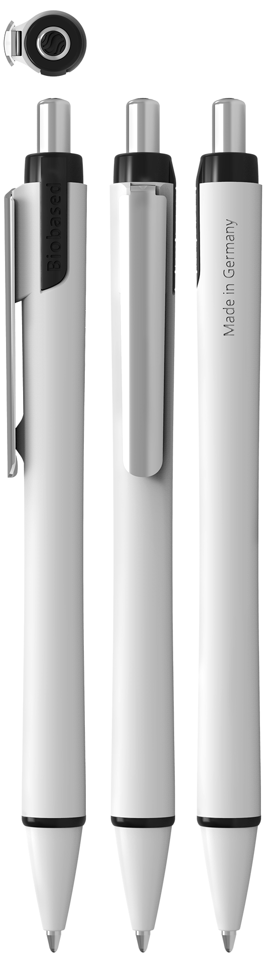 Ballpoint pens with push button with white pen body made of 70% bio-based plastic material. The Viscoglide®-Technology for extraordinarily smooth and gliding writing.
