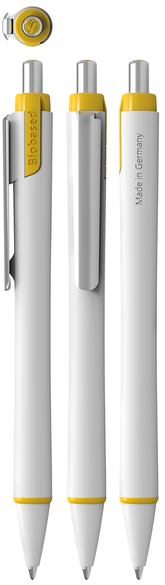 Ballpoint pens with push button with white pen body made of 70% bio-based plastic material. The Viscoglide®-Technology for extraordinarily smooth and gliding writing.