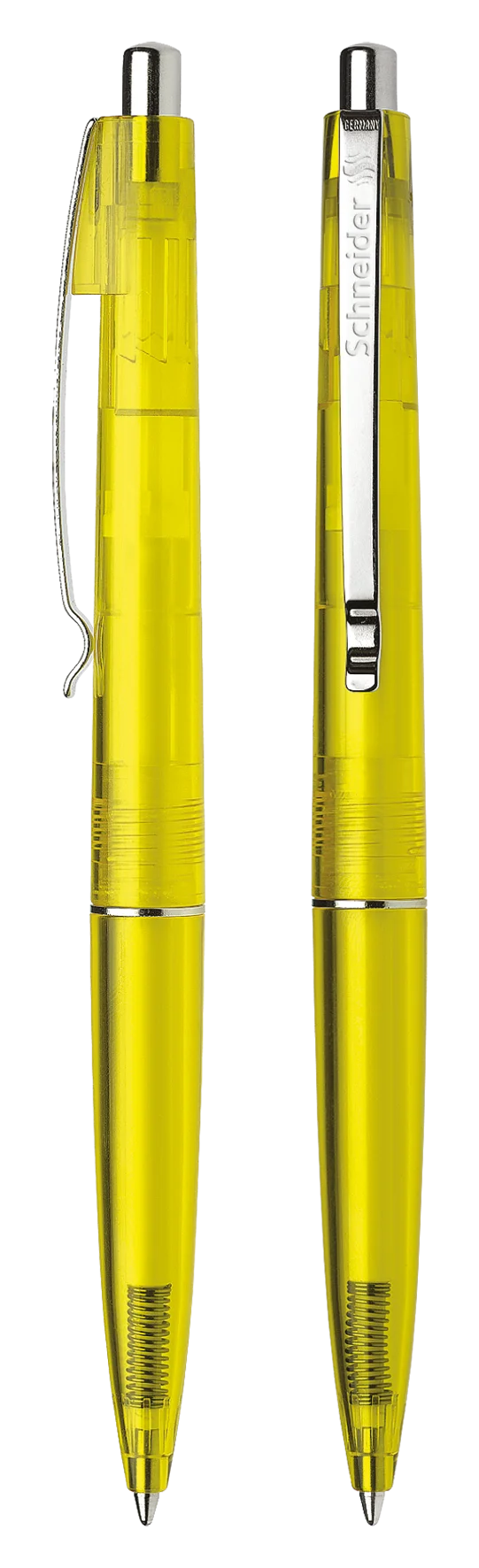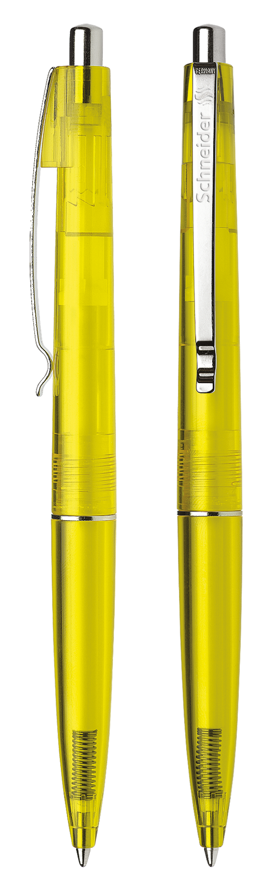 Ballpoint pen with push button made of transparent plastic.