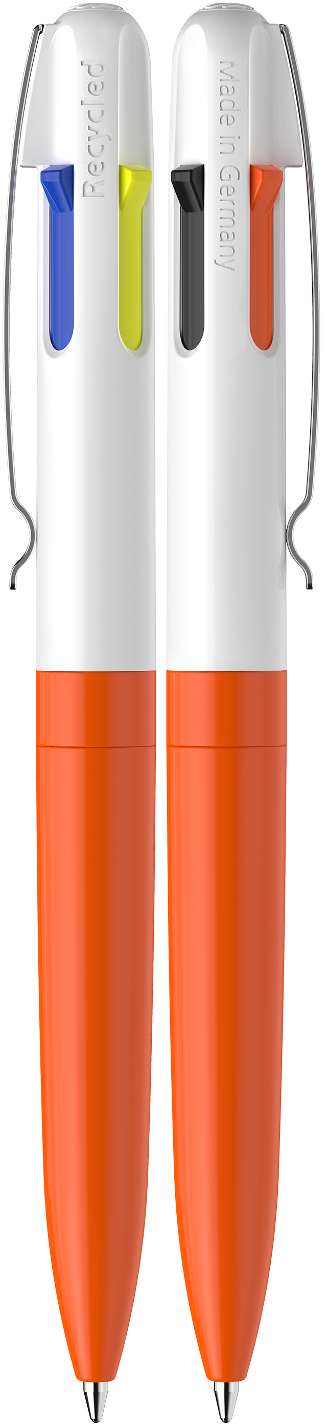 Four-colour ballpoint pen in a neon edition with a *pen body made of 92% recycled plastic. Available in four bright barrel colours and in different writing colours.