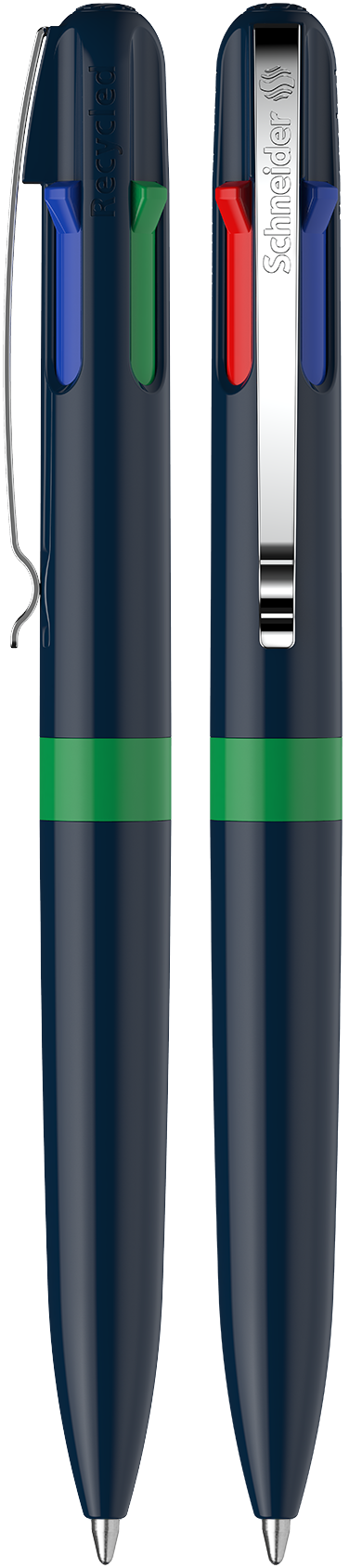 Four colour ballpoint with the writing colours black, red, blue, green. Pen body made of 92% recycled plastic.