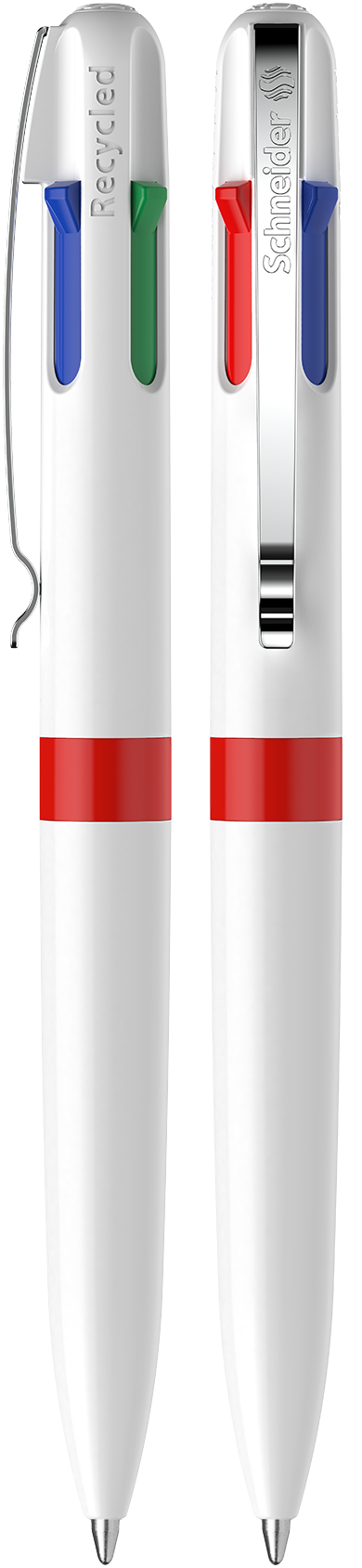 Four colour ballpoint with the writing colours black, red, blue, green. Pen body made of 92% recycled plastic.