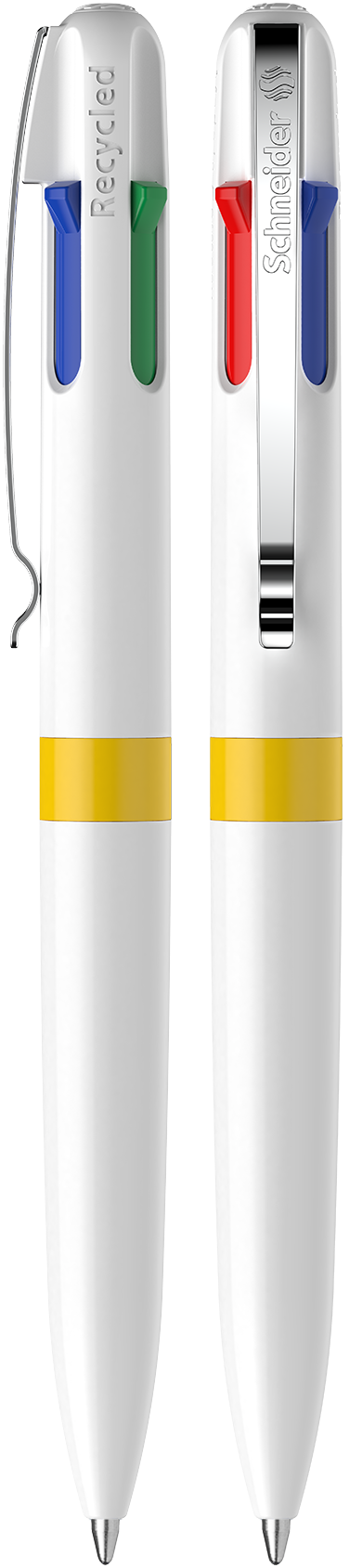 Four colour ballpoint with the writing colours black, red, blue, green. Pen body made of 92% recycled plastic.