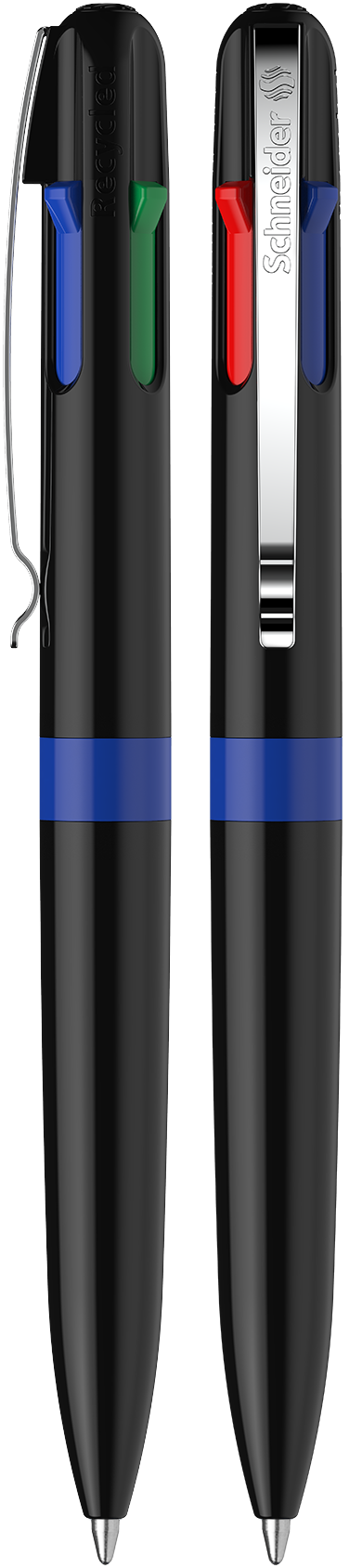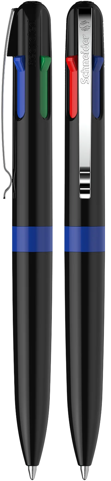 Four colour ballpoint with the writing colours black, red, blue, green. Pen body made of 92% recycled plastic.
