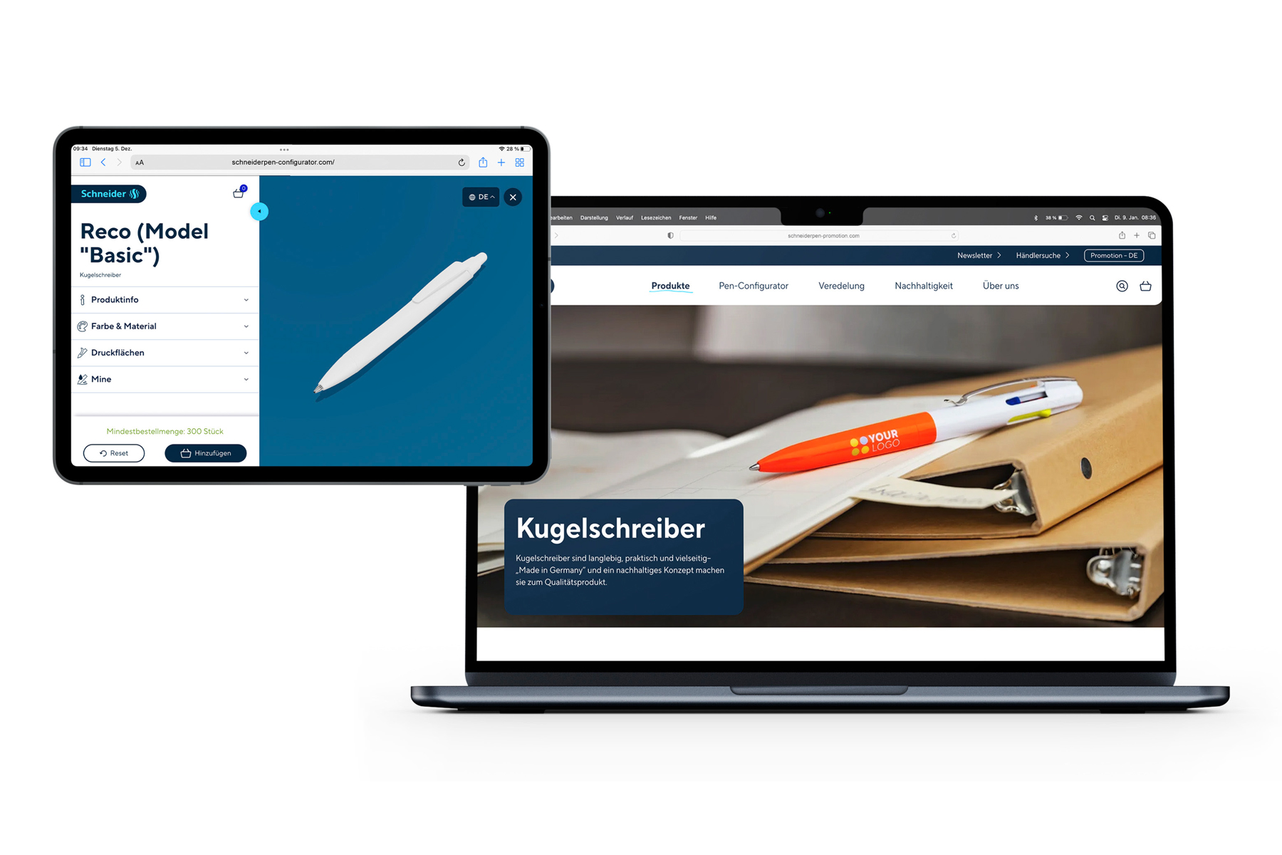 Of particular interest to retailers and resellers: the Pen Configurator can be integrated into your own website with your own logo and branding. This allows the popular configuration tool to be seamlessly integrated into existing online presences, ensuring a professional appearance, brand conformity and individual recognition value. Interested partners are welcome to contact the Schneider Promote Team at promotion@schneiderpen.com.