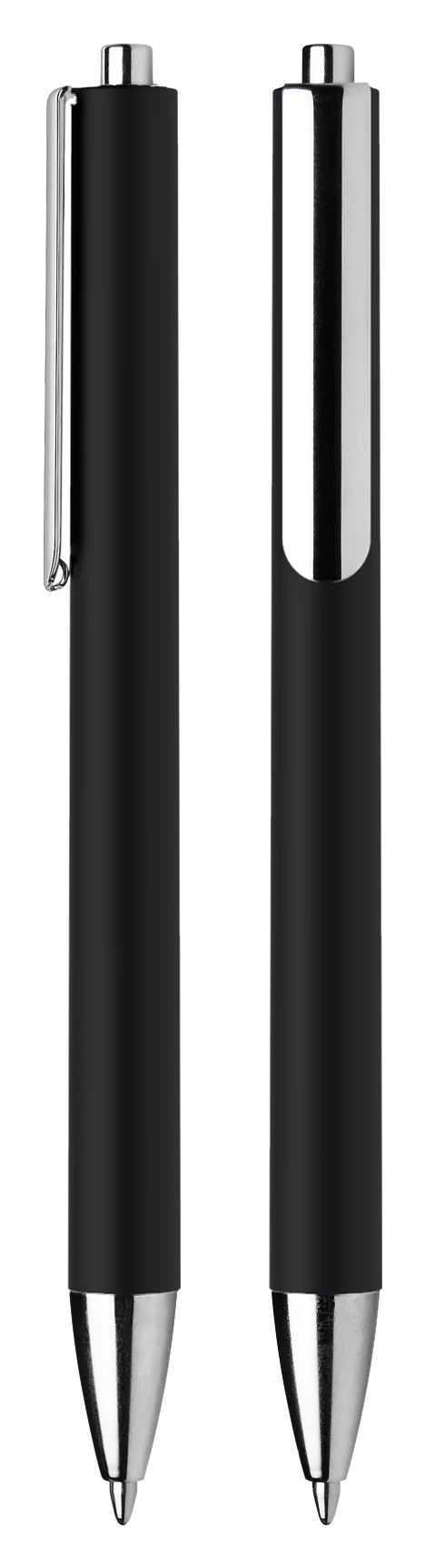 Partie supérieure finition Soft-Touch. Pointe du corps, clip et bouton poussoir en métal.
