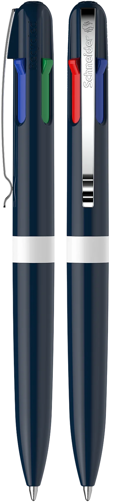 Stylo à quatre couleurs, couleurs d’ encre : noir, rouge, bleu et vert. Corps composé de 92% plastique recyclé.