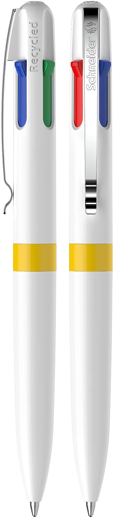 Stylo à quatre couleurs, couleurs d’ encre : noir, rouge, bleu et vert. Corps composé de 92% plastique recyclé.